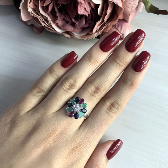 Родированное серебряное кольцо 925 пробы с натуральным сапфиром 3.37ct, изумрудом, рубином. Родированные украшения дольше сохраняют свое первоначальное состояние, а именно цвет и блеск металла. Все ювелирные изделия представленные на нашем сайте прошли внутренний контроль качества, а также контроль государственной пробирной службой Украины, на всех изделиях стоит соответствующая проба. К каждому ювелирному украшению прилагаются бирка с указанием всех параметров.*Цвета изделий на сайте могут незначительно отличаться от реальных из-за особенностей цветопередачи экрана